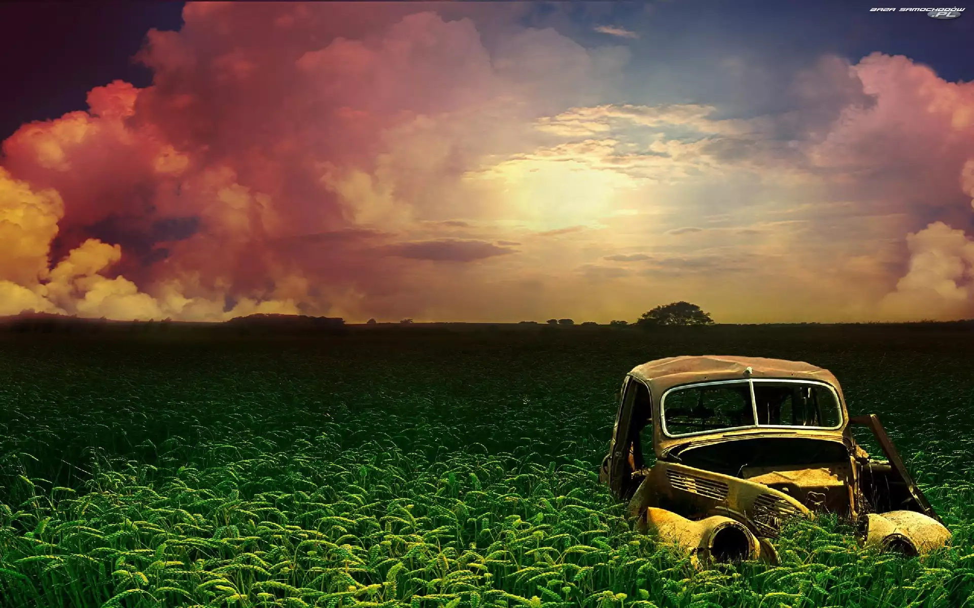 Retro, Samochód, Słońca, Zachód, Zboża- Zdjęcia samochodów